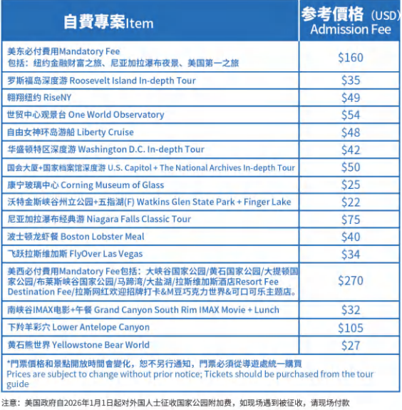 5.景點門票(必付項目和自費項目) MANDATORY AND OPTIONAL ADMISSION FEE