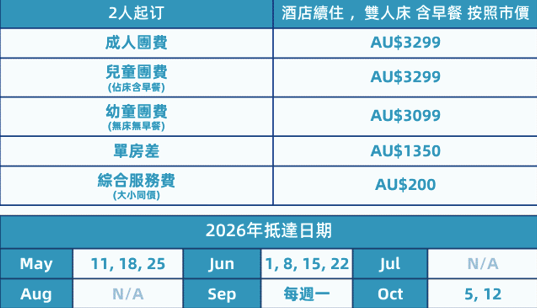 綜合服務費(請與團費一起支付)、機票、簽證、旅遊保險、個人消費, 及因不可抗力導致行程受阻而產生的額外費用