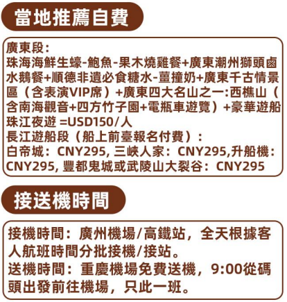 重要提示:遊船行程參考性說明:遊船段行程安 排僅供參考。受季節性調整、氣候變化及航道狀