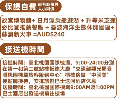 抵達臺北桃園國際機場(TPE),9:00 - 24:00分別在第一和第二航站樓抵達大廳“交通部觀光局臺灣桃園機場旅客服務中心”櫃檯旁舉“中國美”接站牌接待,安排旅遊巴士送回酒店休息。相鄰2小時內航班的客人,我們將統一安排車輛接送,接機可能會有等待現象,敬請諒解!(酒店15:00後可辦理入住,具體接機/接站資訊和酒店詳情請見出團通知書)