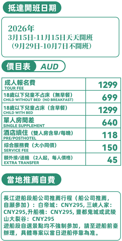 重要提示:遊船段行程僅供參考,季節性調整或是氣候以及航道等因素的影響,每日行程可能會有所改變,具體行程以當日船公司安排行程為准,遊船公司保留對行程的最終解釋權.