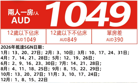 ● 提前或續住酒店:AUD148房/晚,額外接/送機 AUD45/人/趟(2人起);