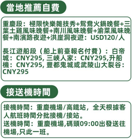 重要提示:遊船段行程僅供參考,季節性調整或 是氣候以及航道等因素的影響,每日行程可能會有所改變,具體行程以當日船公司安排行程為准,遊 船公司保留對行程的最終解釋權.