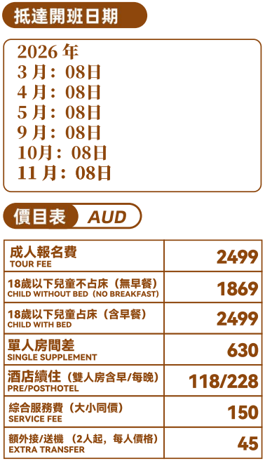 注:以上行程僅為參考,如(堵車、惡劣天氣、景點關門、突發事件、觀光旺季等),根據實際預訂情況,具體行程 (酒店、用餐、城市及景點遊覽順序)以出團通知書為准,敬請理解!