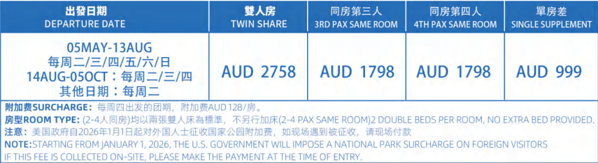 4.小費每人每天USD15,按預訂行程的天數計算TIPPING USD15/PERSON/DAY