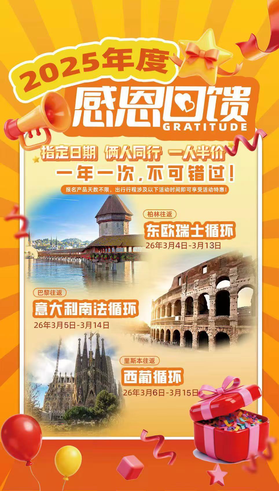 1. 2025欧洲感恩特惠,2人同行, 1人半价,一年一次, 不容错过