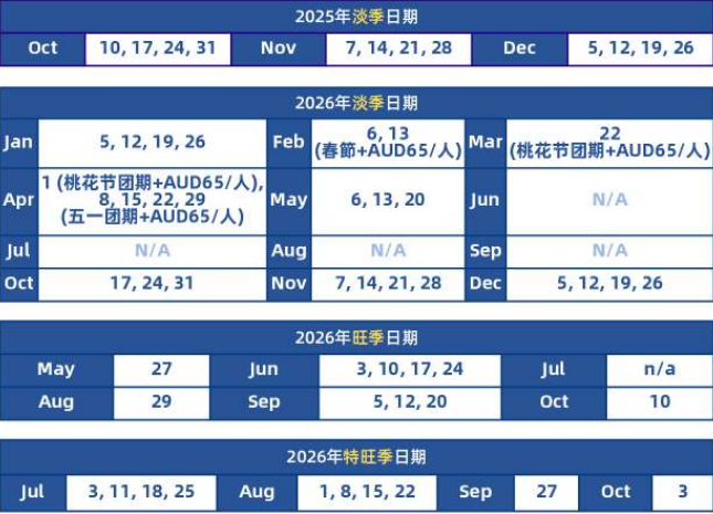 **淡季期間以下團期需要額外加附加費: AU$65 /人