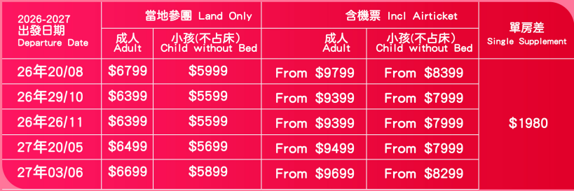 *若機票需要早於團出發前60天以上出,我們會及時通知客人繳交全款。