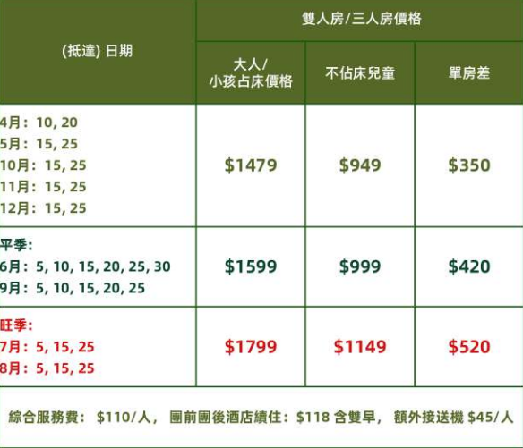 (4,5,10-12月)成人/小孩占床 AU$1,479|兒童不佔床$949|單間差$350