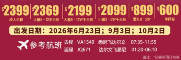 提前1.5小时自行前往悉尼国内T2机场,乘坐飞机飞往“澳洲北领地门户”——达尔文。抵达后导游接机,开启轻松的达尔文市区观光之旅。前往俯瞰港湾的达尔文【海滨区】,这里是城市最具活力的休闲区域,碧海蓝天与热带风情交相辉映。随后途经市中心、 【战争纪念区】等地,感受这座热带城市独特的历史与现代融合。晚间入住酒店休息,为接下来的自然探险养精蓄锐。