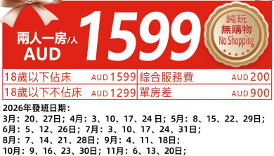 3.提前或續住酒店 AUD118房/晚,額外接/送機 AUD45/人/趟(2人起);