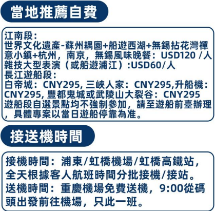 重要提示:遊船段行程僅供參考,季節性調整或 是氣候以及航道等因素的影響,每日行程可能會有所改變,具體行程以當日船公司安排行程為准,遊 船公司保留對行程的最終解釋權.