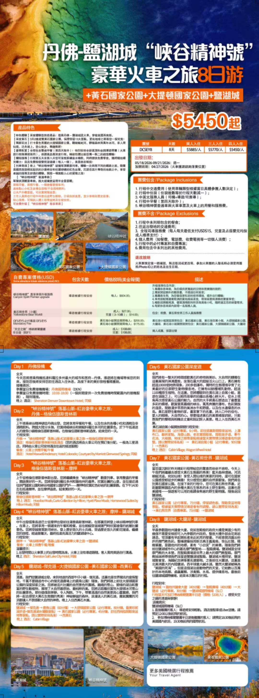 丹佛-盐城胡"峡谷精神号"豪华火车之旅8日游