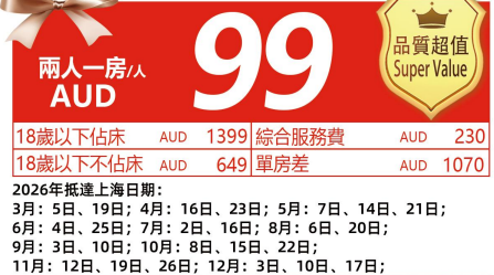 3.提前酒店AUD298房/晚,續住酒店:AUD118房/晚,額外接/送機AUD45/人/趟(2人起);