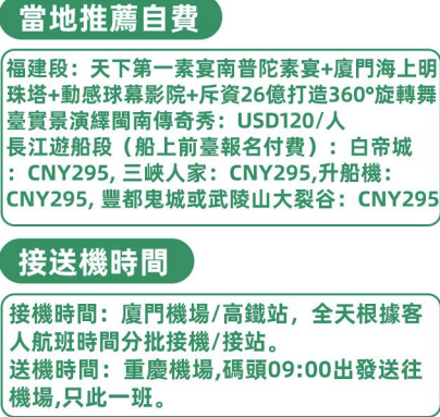 遊船段自選景點均不強制參加,請至遊船前臺辦理,具體專案以當日遊船停靠為准。