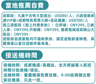 早餐後,抵達重慶,按指定時間送機。(早約8:00-9:00遊船靠岸,隨後碼頭出發送機,由於長江水位高低等因素,遊船抵達靠岸時間可能會延誤,建議預定13:00之後的航班)