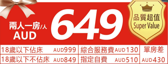18歲以下不佔床早餐費請自行諮詢酒店前臺; ● 提前或續住酒店AUD178房/晚,額外接/送機AUD60/人/趟(2人起);