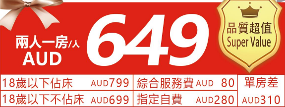 2.18歲以下不佔床早餐費請自行諮詢酒店前臺; 提前或續住酒店AUD178房/晚,額外接/送機AUD60/人/趟(2人起);