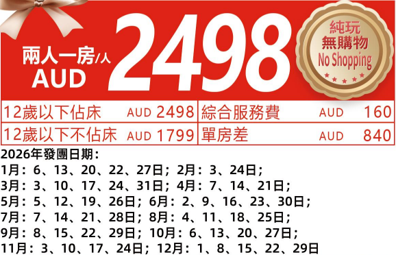 3.提前或續住酒店:AUD250房/晚,額外接/送機 AUD50/人/趟(2人起);