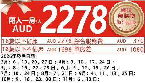 3.提前或續住酒店 AUD118房/晚,額外接/送機 AUD45/人/趟(2人起);
